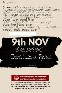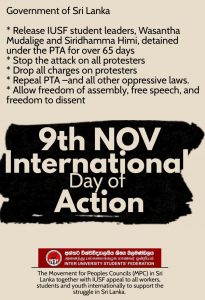 The Movement for Peoples Councils (MPC) in Sri Lanka, together with IUSF (Inter University Student Federation), is appealing to the workers, students and youth, internationally, to support the struggle in Sri Lanka. As a first step, they request organisations to call a protest on 9th of November (or in that week) outside the Sri Lankan Embassies and High Commissions, across the world, to highlight the undemocratic actions of the government.